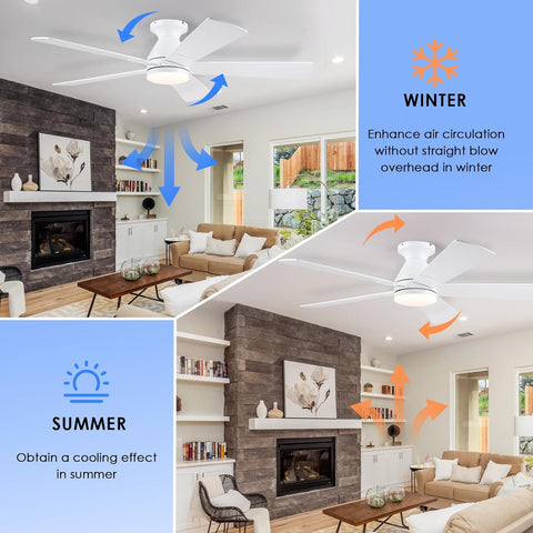 52in Ceiling Fans with Lights - White Flush Mount Ceiling Fan Light with Remote, 6 Wind Speeds and Reversible, Modern Low Profile Fan Light for Indoor/Covered Outdoor