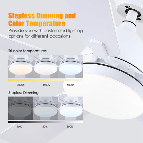 Our ceiling fans with lights come with both remote control and APP control, allowing you to effortlessly adjust the fan speed, three-color dimming, dimmable, applicable voltage: 110V-265V, night light mode, equipped with two 4-inch and 8-inch booms for easy selection of your appropriate heights, experience the convenience of modern technology at your fingertips.