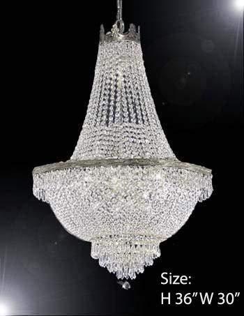This beautiful Chandelier is trimmed with Empress Crystal(TM) 100% CRYSTAL CHANDELIER, this chandelier is characteristic of the grand chandeliers which decorated the finest Chateaux and Palaces across Europe and reflects a time of class and elegance which is sure to lend a special atmosphere in every home. SIZE WD 24X HT 30 9 LIGHTS Assembly Required. Comes with 18 inches of chain and wire